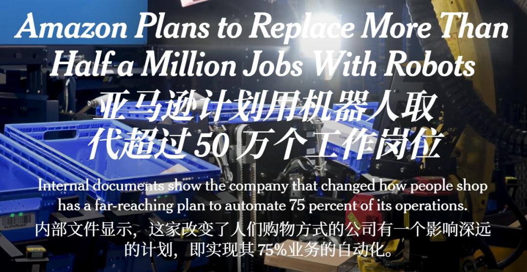 《纽约时报》近日曝光的内部文件显示,亚马逊高管确信公司正站在下一个工作场所巨变的风口:计划用机器人替代超过50万名员工,将运营环节的自动化程度提高到75%。