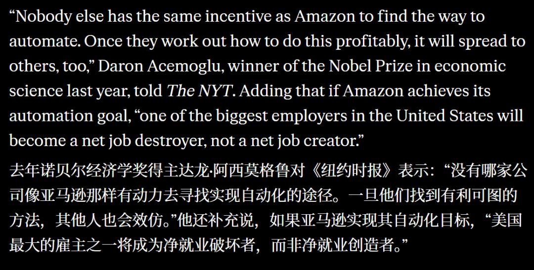 正如麻省理工学院的诺贝尔经济学奖得主达龙·阿西莫格鲁(Daron Acemoglu)所警告的那样,如果亚马逊的机器人计划如愿的话: