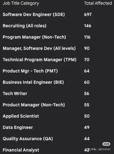 网上流传的另一份裁员岗位分布显示,软件工程师(SDE),特别是刚毕业的初级工程师,是本次裁员人群重灾区。