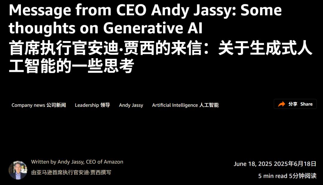 贾西直言不讳地表示:随着AI工具的广泛应用,公司里许多「重复性、流程性的工作」将被自动化取代,人手需求会相应减少。