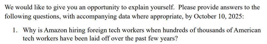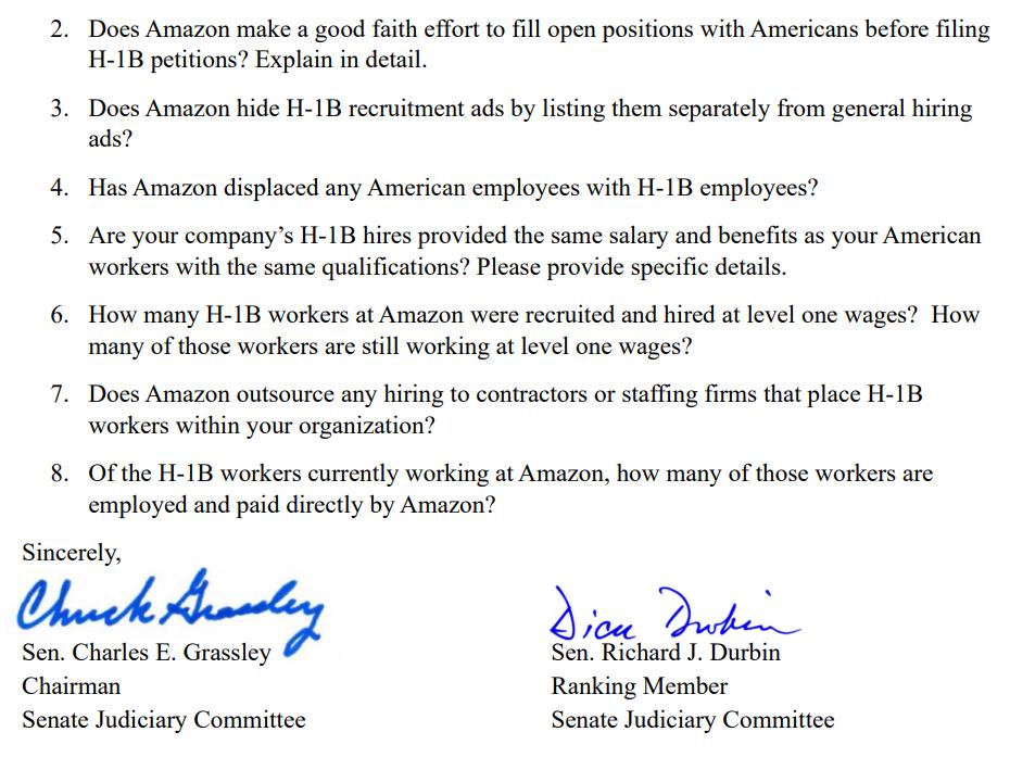 来自两党的一封国会质询信直接点名质问CEO贾西:「你们是不是在利用H-1B机制引入更廉价、易控制的劳动力来替代美国员工?」
