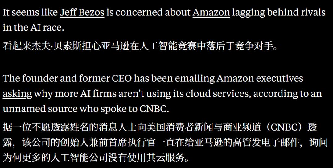 据报道,贝索斯近期频繁给公司高管发邮件,追问「为什么越来越多AI初创公司不选我们AWS」,他忧心忡忡地指出亚马逊在AI云服务上的脆弱处境,明显流露出对「AI算力之战」落败的担忧。