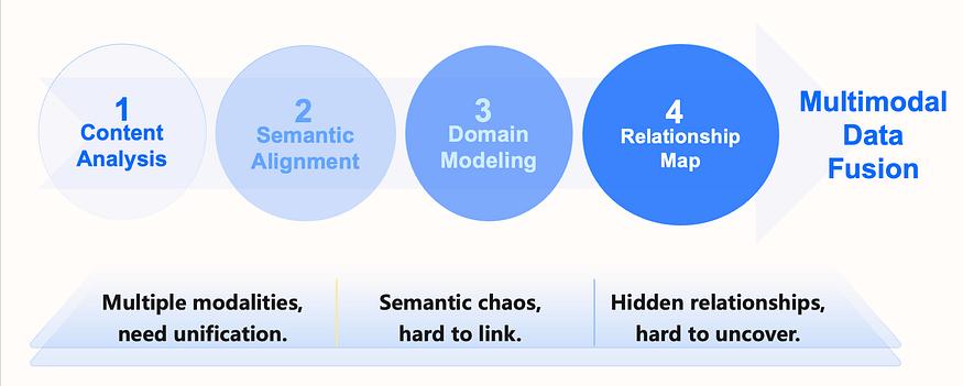 数据智能底座是企业实现智能化转型的核心基础设施,旨在整合多源异构数据,为智能应用提供统一高效的数据支撑。其构建遵循“内容分析、语义对齐、领域建模、关系图谱”四步框架。在这个过程中,天生具备实体和关系处理能力的图数据库在每个阶段都扮演着至关重要的角色,是多模态数据融合和价值提取的基石。