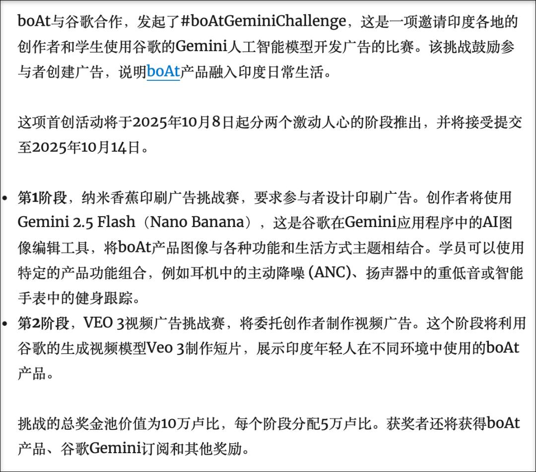 这场活动在十月初发起,名字很长——「boAt × Google Gemini Challenge」;听起来像一场比赛,其实更像一场「社会实验」。