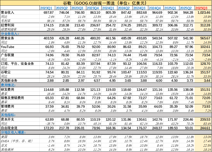 谷歌是目前为数不多既掌握桌面端流量入口(Chrome和Google),又掌握移动端流量入口(Android),还具备大模型能力(Gemini、Waymo等AI产品)和硬件(Pixel)的公司,因此谷歌的财报在一定程度上能够反应现阶段AI发展的全景。