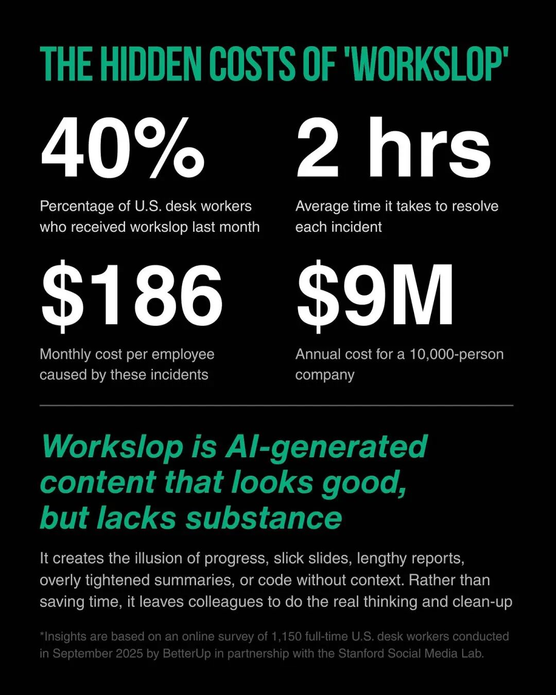 毕竟,就目前而言,AI 带来的除了效率,还有大量的「workslop」 ,workslop 指的是那些由聊天机器人产生的、看似像回事但实则毫无价值、甚至 充满错误的「工作垃圾」 。