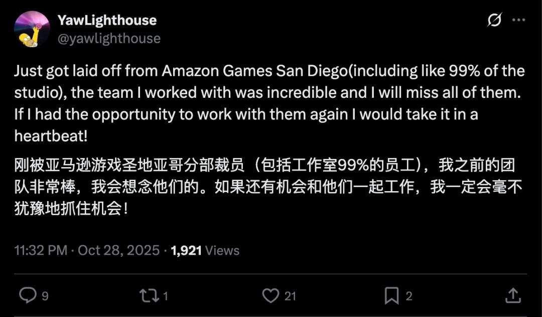 亚马逊游戏工作室圣地亚哥分部,99% 的员工被裁