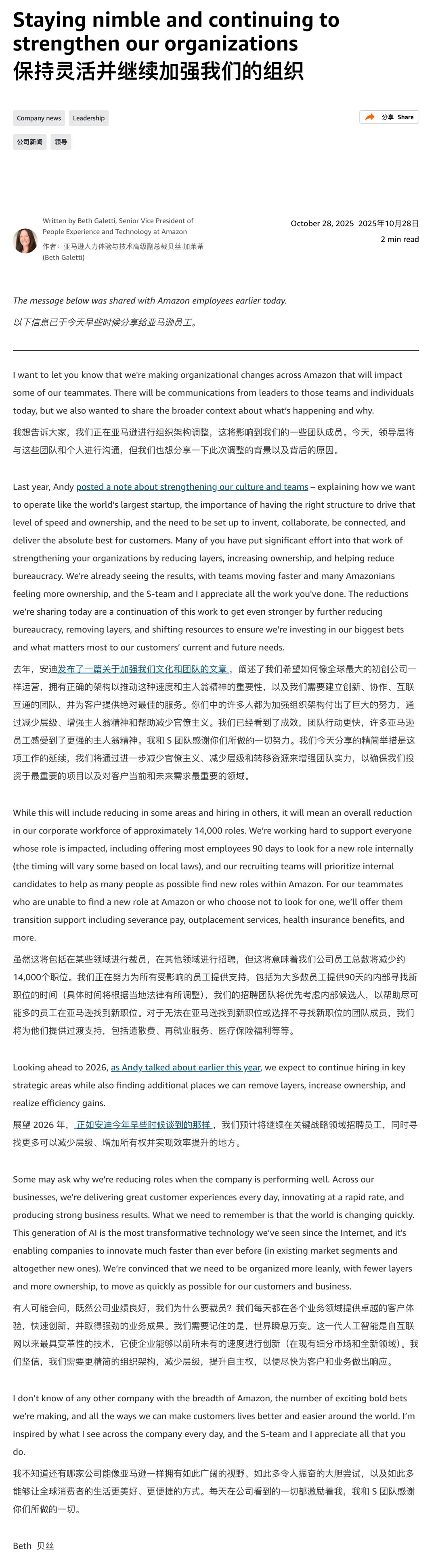 亚马逊的人力资源主管 Beth Galetti,在给全体员工的备忘录中写着,「AI 是自互联网以来,我们所见过的最具变革性的技术」。