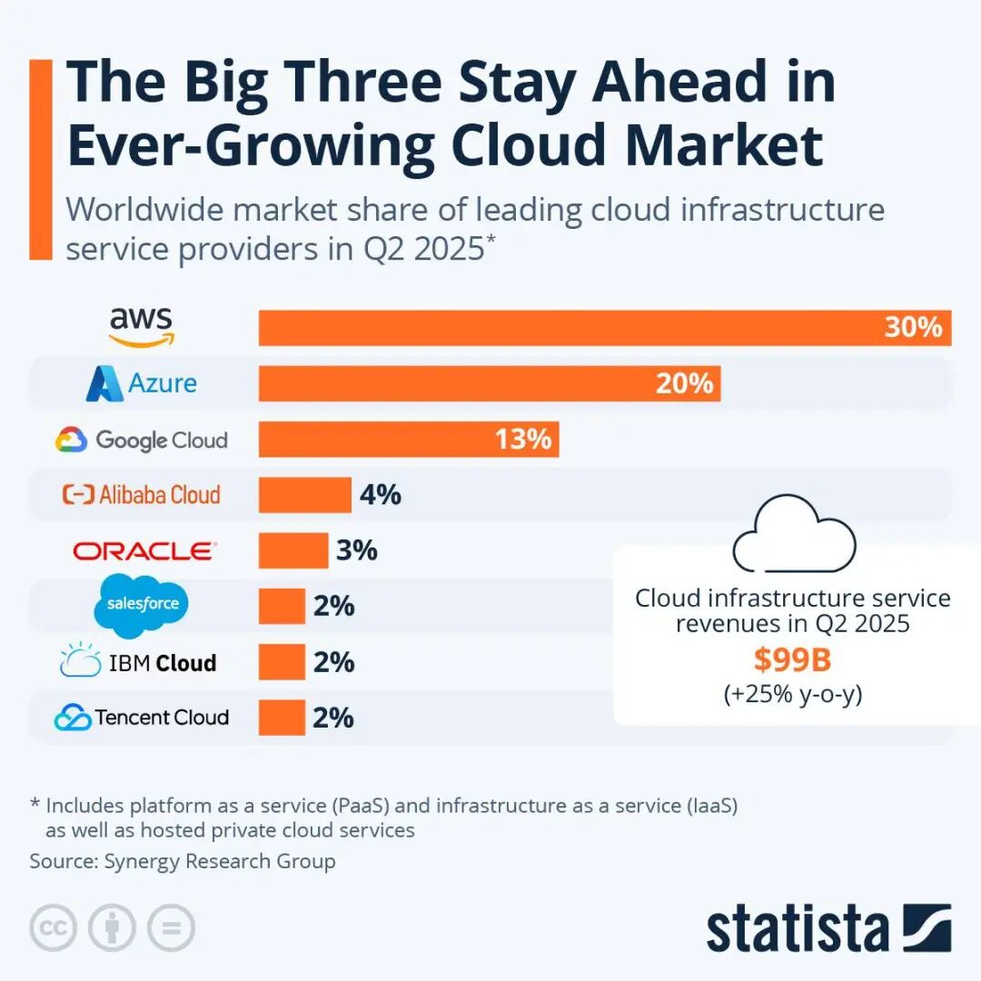 2025 年,亚马逊云服务 AWS 市场份额占据领先地位