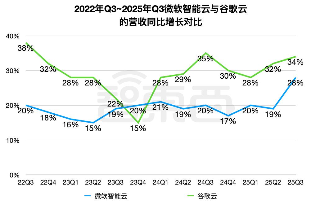 ▲2022年Q3~2025年Q3微软智能云与谷歌云u2028的营收同比增长对比(智东西制图)