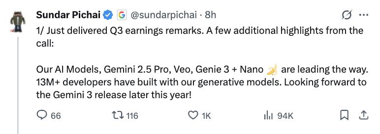 ▲皮查伊在社交平台X上提及电话会议内容