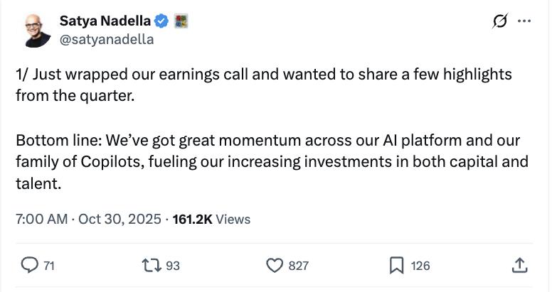 ▲纳德拉在社交平台X上提及电话会议内容