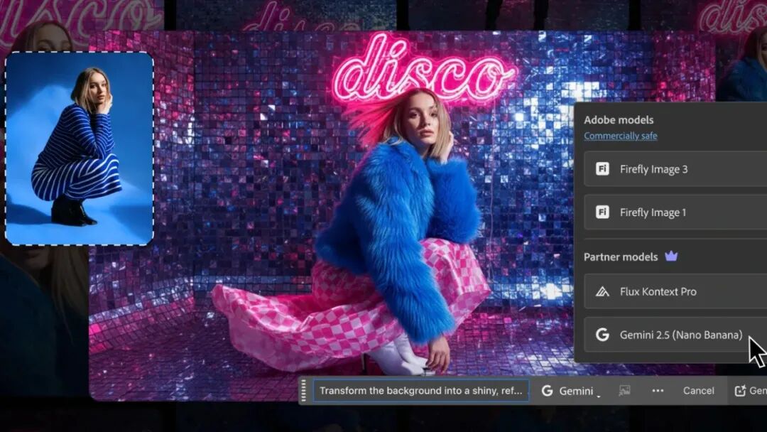 现在用 PS 做生成式填充,除了 Firefly 之外,你还可以在 Gemini 2.5 Flash (Nano Banana) 和 Black Forest Labs 的 FLUX Knotext 中选择,与此前 PS Beta 中的相吻合。