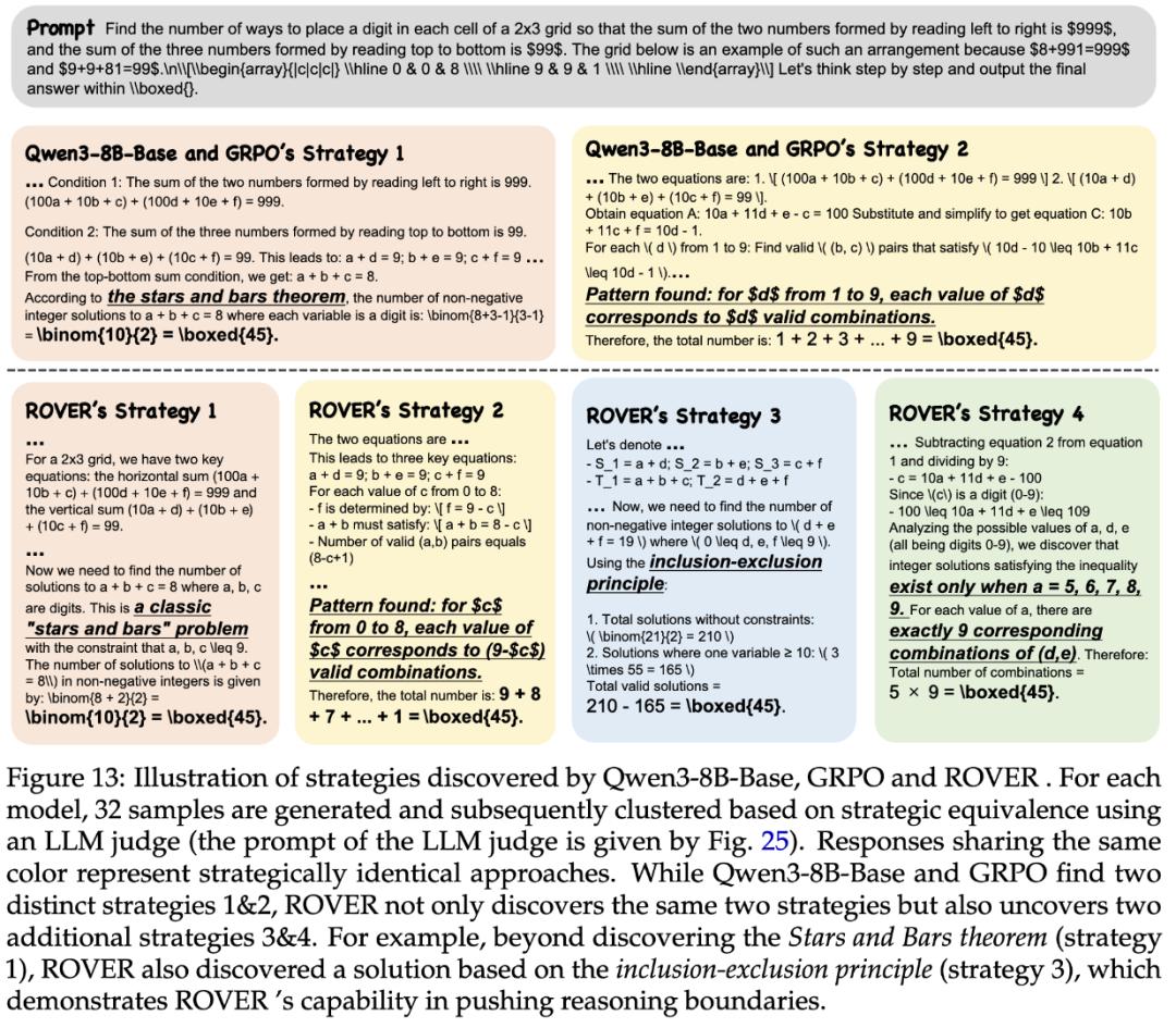 通过「策略数量」指标(同一问题生成的不同推理路径数)评估, ROVER 在各个任务上均能发现更多的解题策略。如下图所示,在「2x3 网格数字排列」问题中,基模型与 GRPO 均仅发现 2 种策略,而 ROVER 可以发现 4 种(包括「隔板法」「容斥原理」等不同数学工具)。