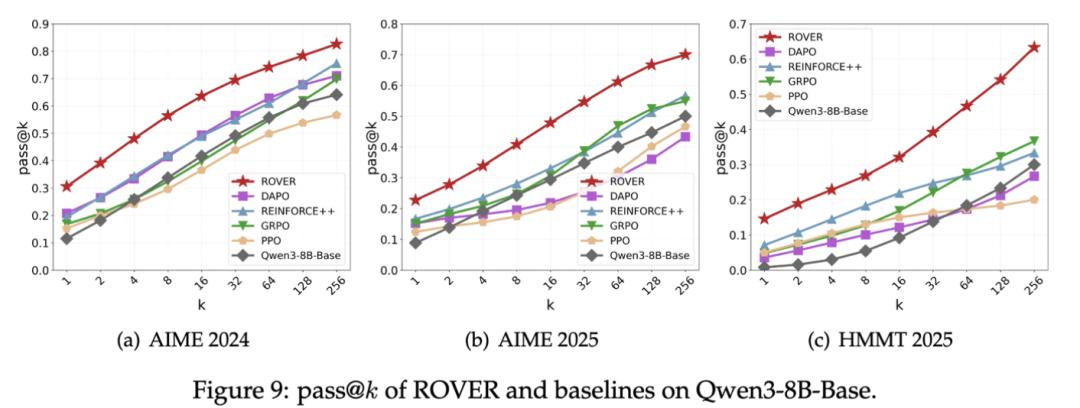 更关键的是 pass@k 性能:传统 RL 方法(如 GRPO)的 pass@k 随 k 增大迅速饱和,而ROVER 在 pass@256 上也能与基线拉开明显差距,展现持续探索能力。