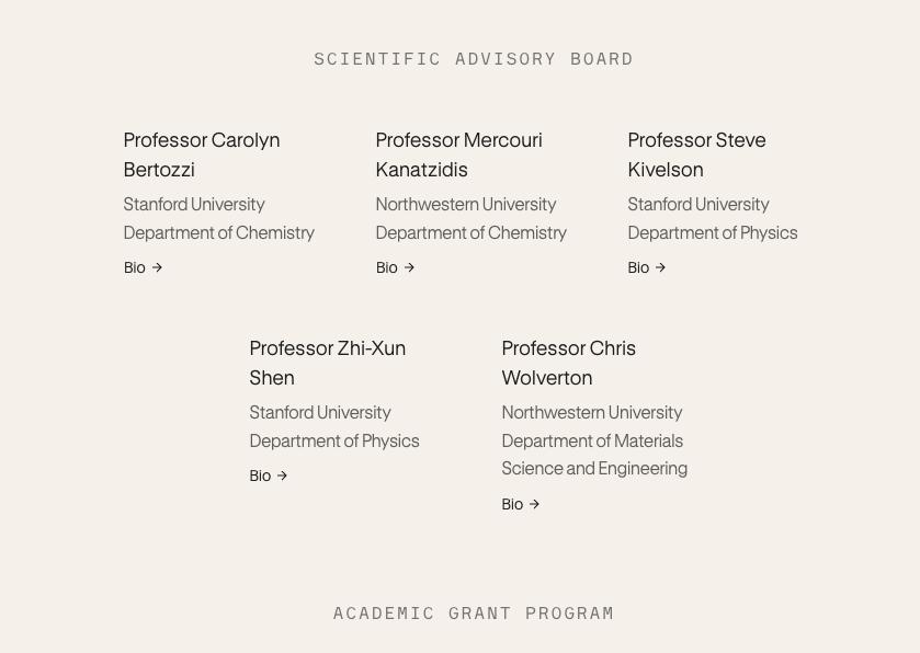 豪华顾问团更强化了这种交叉优势。诺奖得主 Carolyn Bertozzi 领衔的学术委员会中,既有斯坦福大学超导物理权威,也有麻省理工学院材料科学泰斗,为 AI 专家提供全新的搜索算法思路。