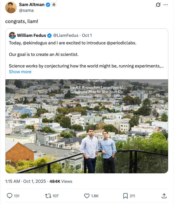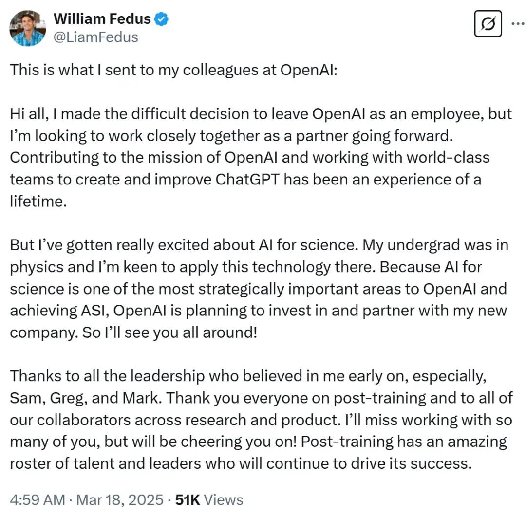 2025 年春,一则令人震惊的离职公告传出:曾任 OpenAI 研究副总裁,负责后训练(post-training)工作的 Liam Fedus 决定离开。他在一条推文中写道,他对 「AI 在科学中的应用」怀有「最具战略意义的兴趣」——那是他将要探索新征程的方向。