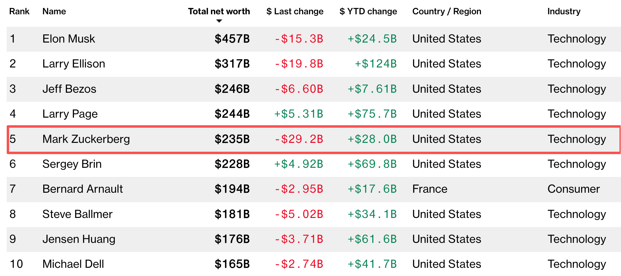 Meta股价的大跌导致扎克伯格的财富单日蒸发292亿美元(约合2076亿元人民币),是彭博亿万富翁指数有记录以来第四大由市场波动引发的单日财富缩水。目前,扎克伯格的净资产已降低至2352亿美元,被亚马逊创始人杰夫·贝佐斯(Jeff Bezos)和谷歌母公司Alphabet创始人拉里·佩奇(Larry Page)超越。自2023年10月以来,佩奇一直未进入全球前四富豪之列。