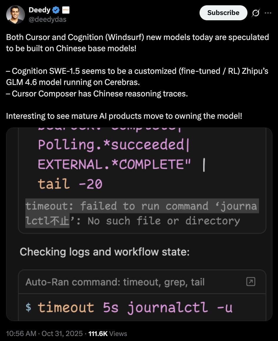 X 博主 @deedydas 认为,Cognition 的 SWE-1.5 是基于中国公司智谱的 GLM 4.6 模型进行定制(精调 / 强化学习),并运行在 Cerebras 的硬件上;Cursor 的 Composer 模型也带有中国式推理痕迹。