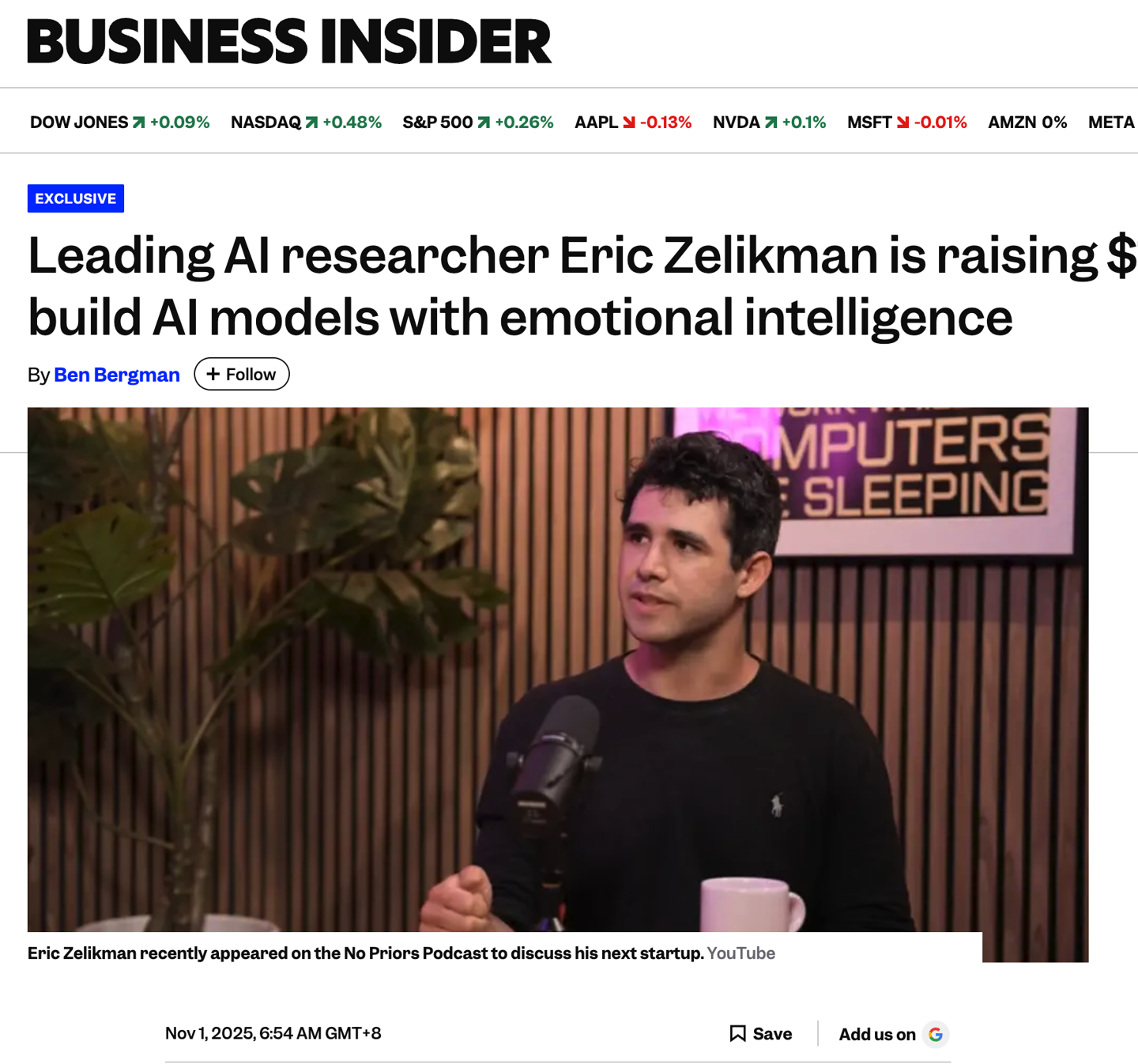 11 月 1 日消息,据《商业内幕》今日报道,知情人士透露,顶尖 AI 研究员埃里克・泽利克曼在今年 9 月离开 xAI 后,正为其新创公司 Humans & 筹集 10 亿美元,估值为 40 亿美元(IT之家注:现汇率约合 284.82 亿元人民币)。