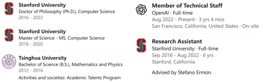 宋飏本科就读于清华大学数理基础科学班,博士毕业于斯坦福计算机科学专业,研究方向聚焦生成模型与多模态推理。