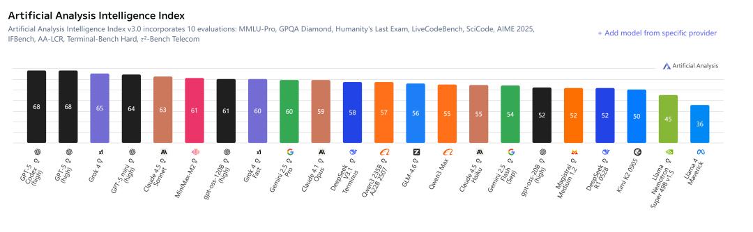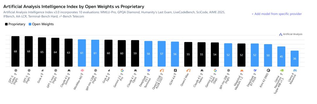 在Artificial Analysis Intelligence指数榜单上,除了排在前几名是闭源的OpenAI的GPT-5、谷歌的Gemini 2.5、xAI的Grok、Anthropic的Claude 4.5以外,紧随其后的都是开源模型。