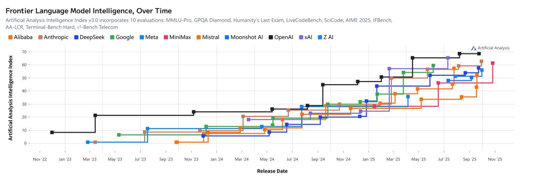 在随着时间,AI能力增长这件事情上,虽然OpenAI一直遥遥领先,但MiniMax、DeepSeek、Qwen、GLM、Kimi追改的速度一点都没有落下。