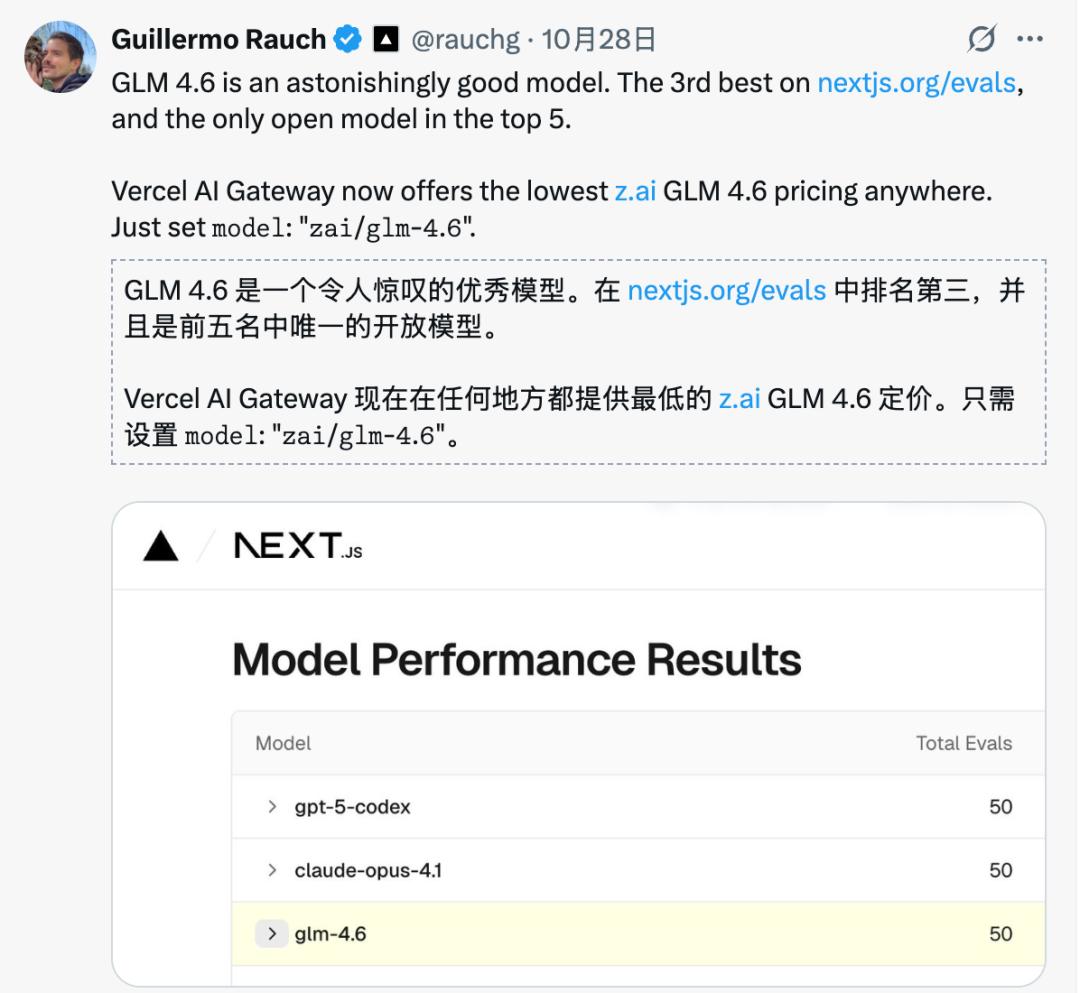 比如Vercel的老板Guillermo Rauch就表示,鉴于GLM-4.6的出色表现,「在nextjs.org/evals中排名第三,并且是前五名中唯一的开源模型」。