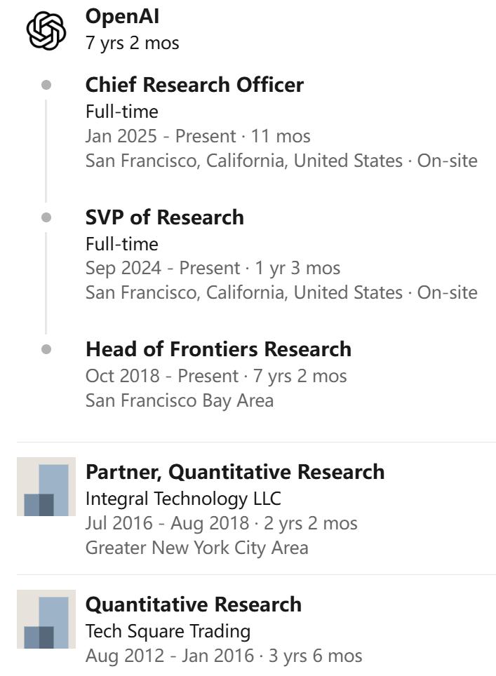 在OpenAI的七年时间里,陈信翰从研究科学家逐步晋升为首席研究官,负责模型开发和公司整体研究工作。
