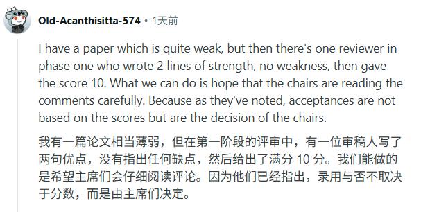 我给出了一份详细的负面评语,但另一位评审写了两行优点,打了满分10。最后论文进了。