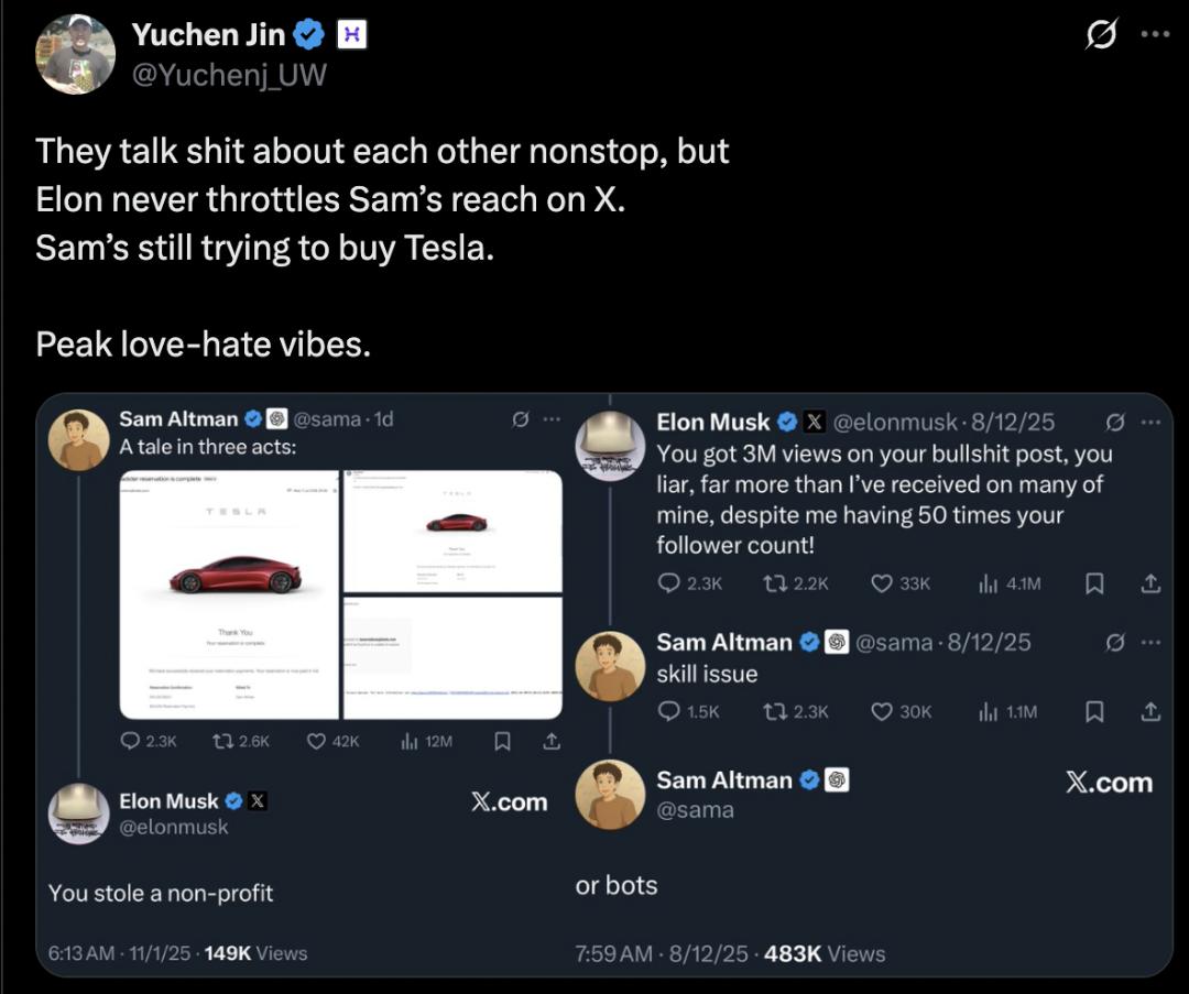 这已经不是马斯克和奥特曼第一次在 X 上打嘴仗了,有网友调侃「他们不停地互相诋毁,但是马斯克从未限制过奥特曼在 X 上的影响力,奥特曼还在努力想买特斯拉,这俩人爱恨交织的情绪达到了顶峰。」