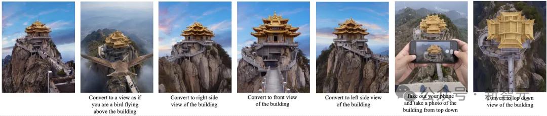 给定一张建筑正面图,指令「切换到俯视图」,模型能像拥有3D建模能力一样,合理地生成新视角。