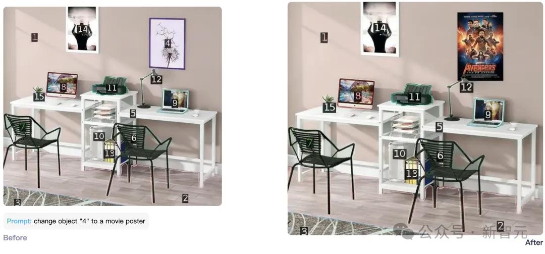指令「将图片中标号为4的物体换成电影海报」,模型能精准定位并替换。