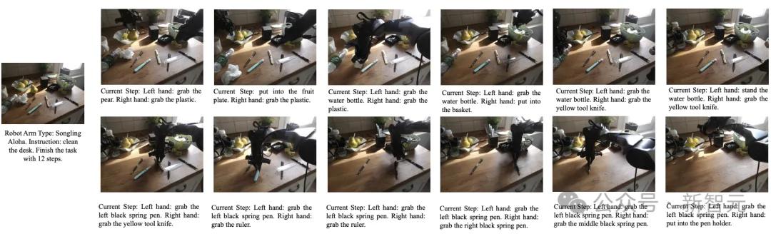 这是Emu3.5最具想象力的应用之一。给定一个任务,如「用松灵机械臂把桌面收拾好,12 步完成」,模型能生成一个包含12个步骤的、由松灵机器人手臂执行的图文序列。它不仅规划了子任务,还生成了每个关键步骤的视觉状态。这为解决具身智能领域「数据稀缺」的痛点提供了全新的思路——用世界模型生成海量的、泛化的仿真数据。