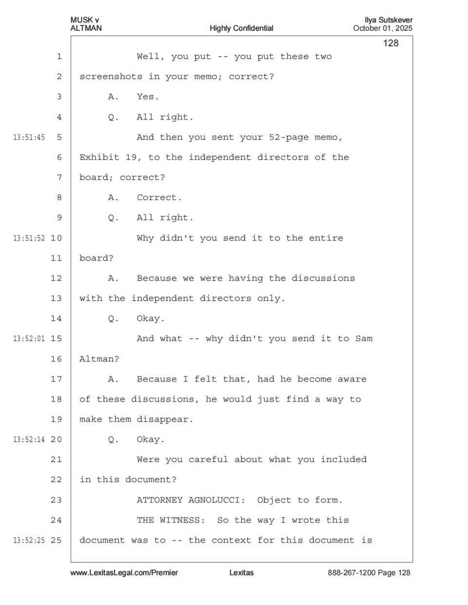 答:我撰写这份文件的背景是,独立董事要求我准备该文件,我已按要求完成。我在撰写过程中十分审慎。文件中包含的截图(大部分或全部,具体数量我已记不清)均来自米拉・穆拉蒂(Mira Murati,OpenAI前首席技术官)。我把这些截图纳入文件,是为通过大量零散证据或材料呈现完整情况,此举具有合理性。