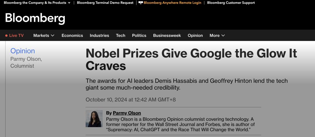 对此,彭博社科技专栏撰稿人 Parmy Olson 对诺奖背后所蕴藏的更深意味进行了极为冷峻的批评。Olson 在社论中称,Hassabis 的获奖成果固然惊人,但同时可能掩盖了少数科技巨头 AI 集权的事实,「诺贝尔基金会似乎急于将 AI 的进步,以及计算可解的科学理念,视为该至高奖项的有力竞争者,但这种认可也存在着风险,它可能掩盖人们对这项技术本身以及 AI 技术日益集中于在少数几家公司手中的担忧。」