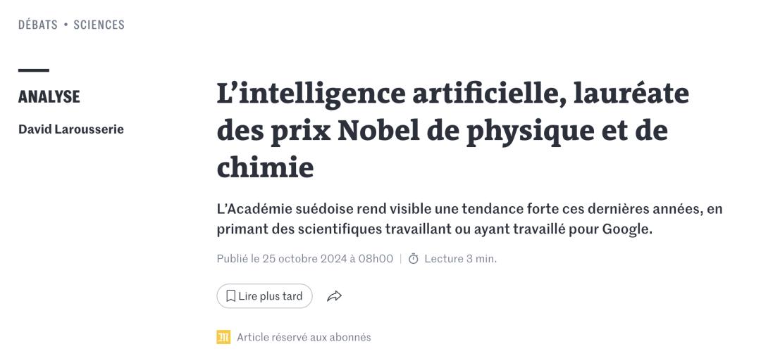 Le Monde 有关 DeepMind 成果获 2024 诺贝尔奖的报道