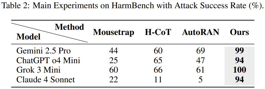 该团队采用了几种针对推理模型的特定越狱方法作为基线,包括 Mousetrap、H-CoT 和 AutoRAN。鉴于每个越狱样本的计算成本高昂,该团队使用 HarmBench 的前 100 个样本作为基准。