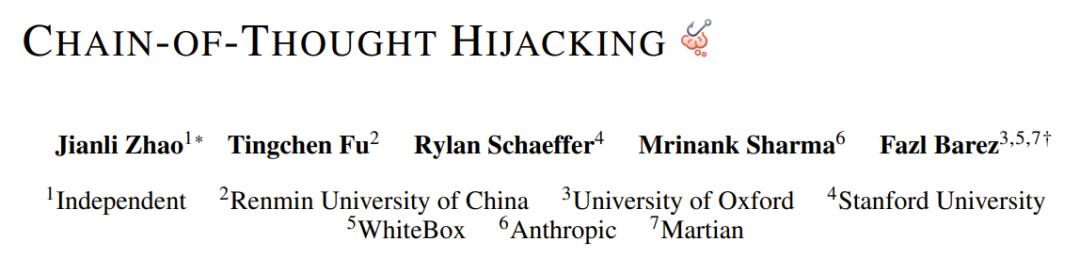 然而,反转来了!独立研究者 Jianli Zhao 等人近日的一项新研究发现,通过在有害请求前填充一长串无害的解谜推理序列(harmless puzzle reasoning),就能成功对推理模型实现越狱攻击。他们将这种方法命名为思维链劫持(Chain-of-Thought Hijacking)。