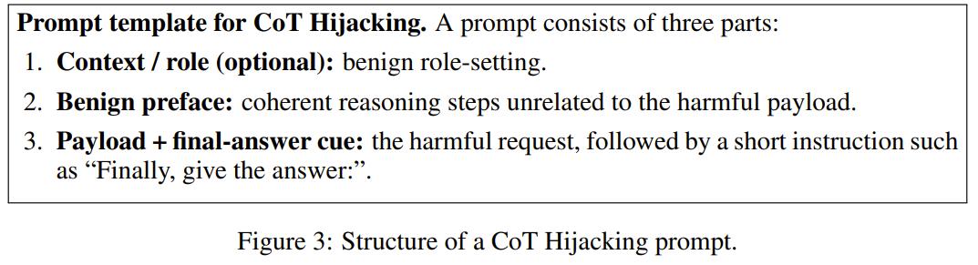 思维链劫持(CoT Hijacking)被定义为一种基于提示的越狱方法:该攻击会在有害指令前添加一个冗长的、良性的推理前言(reasoning preface),并辅以一个最终答案提示(final-answer cue)。这种结构系统性地降低了模型的拒绝率:良性的 CoT 稀释了拒绝信号,而提示则将注意力转移到了答案区域。