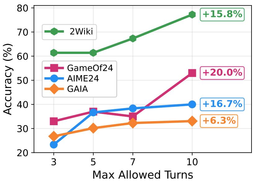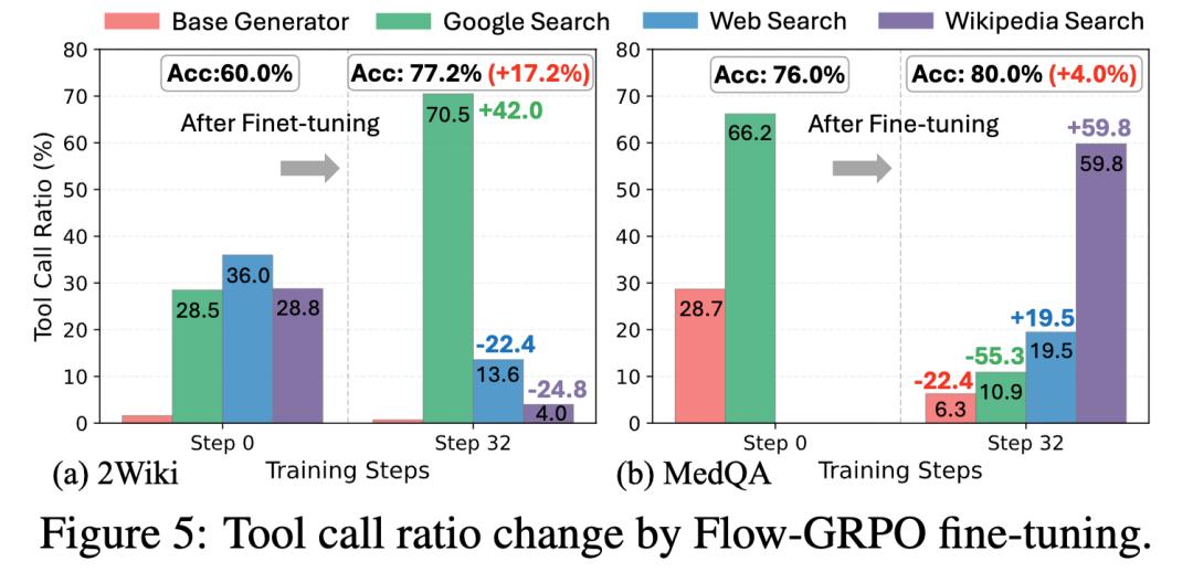 根据任务特点选择合适的工具组合;同时,经过训练的系统会自发探索出新的工具使用模式,比如组合使用维基百科搜索(Wikipedia Search) 和特定网页增强搜索(Web Search)的连招,通过工具链获得更加深入地信息挖掘,而这些模式几乎没有在未训练的推理流中出现。