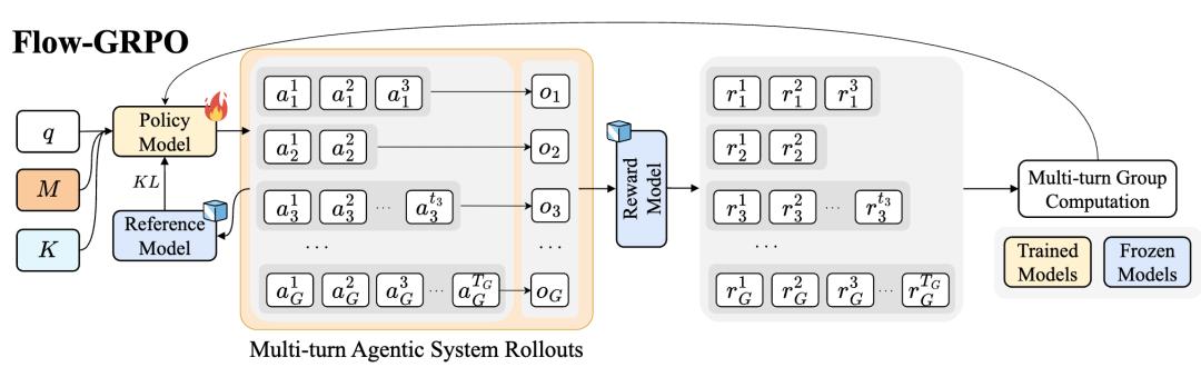 团队提出Flow-GRPO(Flow-based Group Relative Policy Optimization)算法,专门针对多轮推理场景设计。核心思想是将轨迹最终的奖励信号(成功/失败)广播到每一步动作,把复杂的多轮强化学习问题转化为一系列单轮策略更新。
