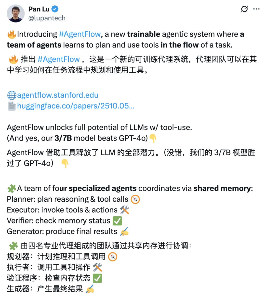 【导读】传统智能体系统难以兼顾稳定性和学习能力,斯坦福等学者提出AgentFlow框架,通过模块化和实时强化学习,在推理中持续优化策略,并使小规模模型在多项任务中超越GPT-4o,为AI发展开辟新思路。