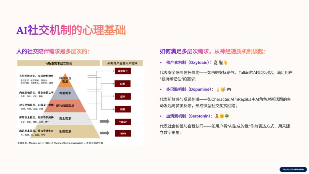 当然,这些治理的目的,还是要让AI为人服务。因此,我们也需要看到 AI 陪伴的社会价值与人机关系的哲学意蕴。AI 可以提供 7×24 小时的陪伴,帮助独居者、残障人士和老年人感受到关怀;借助大模型的学习能力,它能够根据用户习惯与偏好提供个性化服务;它可以在隐私更安全的环境下倾听秘密与负面情绪,降低求助门槛。在心理支持方面,AI 结合认知行为疗法为抑郁和焦虑患者提供自助干预,Woebot 与国内树洞类应用就是例子。在教育与育儿场景,AI 帮助儿童语言启蒙、培养阅读习惯;在养老场景,AI 机器人提醒用药、鼓励运动,甚至帮助检测情绪状态。从神经科学视角,人与 AI 互动时大脑分泌催产素、血清素、多巴胺,分别对应信任与亲密感、自我价值和奖励机制。适度使用 AI 可以激活这些机制,缓解孤独、提高自我认同。