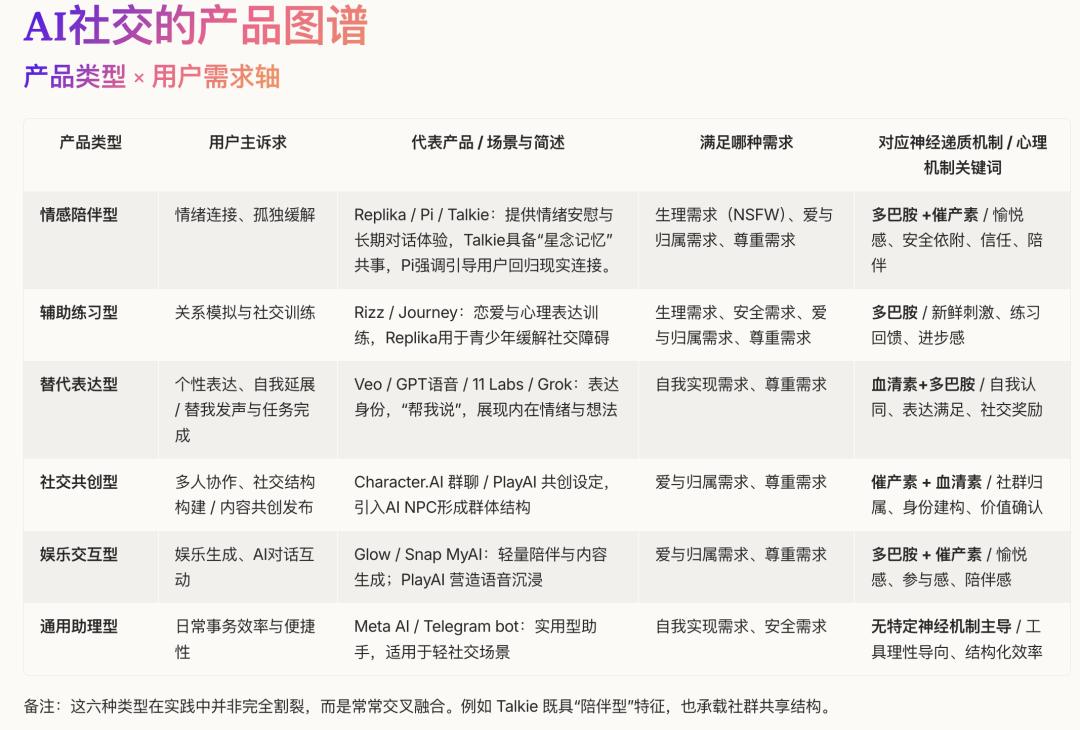 市场的多样性进一步加大了竞争难度。根据产品满足的不同层次的情感需求,我们把市面上的产品分为情感陪伴、辅助练习、替代表达、社交共创、娱乐互动和通用助理六大类:情感陪伴强调倾听与共情,辅助练习提供恋爱或社交技巧,替代表达帮助用户延展自我,社交共创聚焦多方互动,娱乐互动追求新奇体验,通用助理强调效率管理。