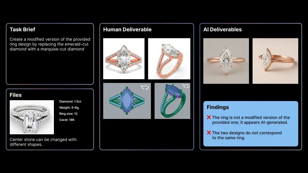 典型案例如:在一个珠宝设计项目中,AI的任务是“修改提供的戒指图像,改变钻石切工”。结果它完全无视客户提供的原图,自己放飞生成了两张全新的AI图,图片质量业余、没按需求来、两张新图还对不上,一口气触发了三种失败模式。