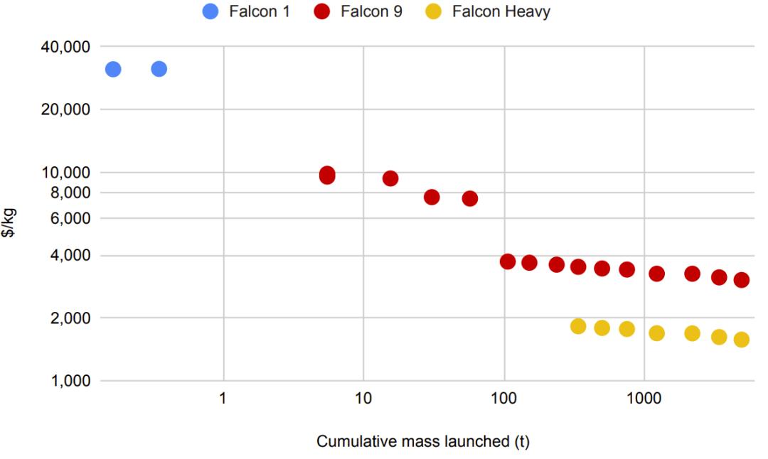 自 Falcon 1 成功发射以来,按通胀调整后的「最低实现价格」统计的 SpaceX 有效载荷发射质量,按不同火箭类别递进展示。请注意,在 Falcon 9 和 Falcon Heavy 火箭出现了显著的价格跃降。