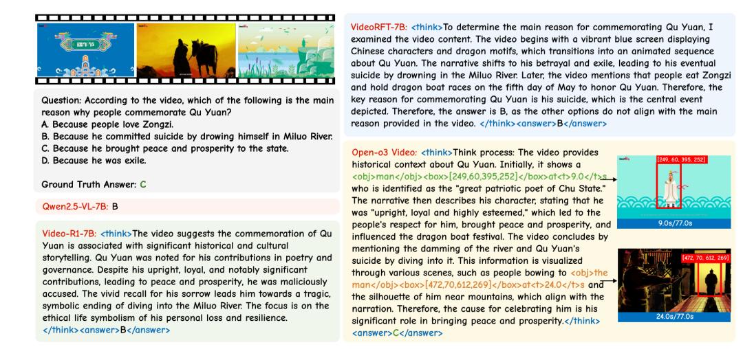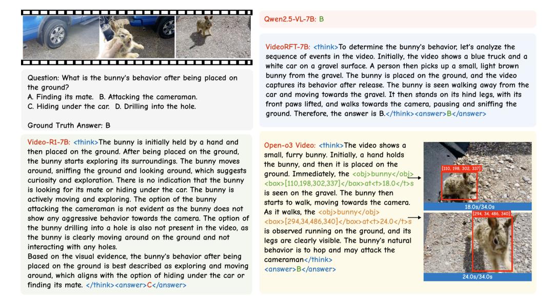这些示例分别体现了Open-o3 Video在处理物体外观识别,动作意图分析,以及天气推理上的突出性能。