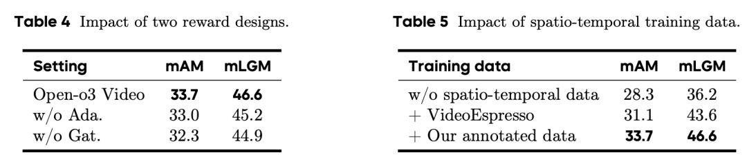 综上,消融实验全面验证了Open-o3 Video的三项核心设计理念,统一的时空数据、双阶段训练机制与自适应奖励策略,在提升模型可解释性与可靠性方面的显著贡献。