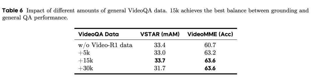 实验表明,适度的通用QA样本能有效平衡模型的语言生成与证据定位能力。当额外加入15k条通用VideoQA样本时,模型实现了最佳平衡。